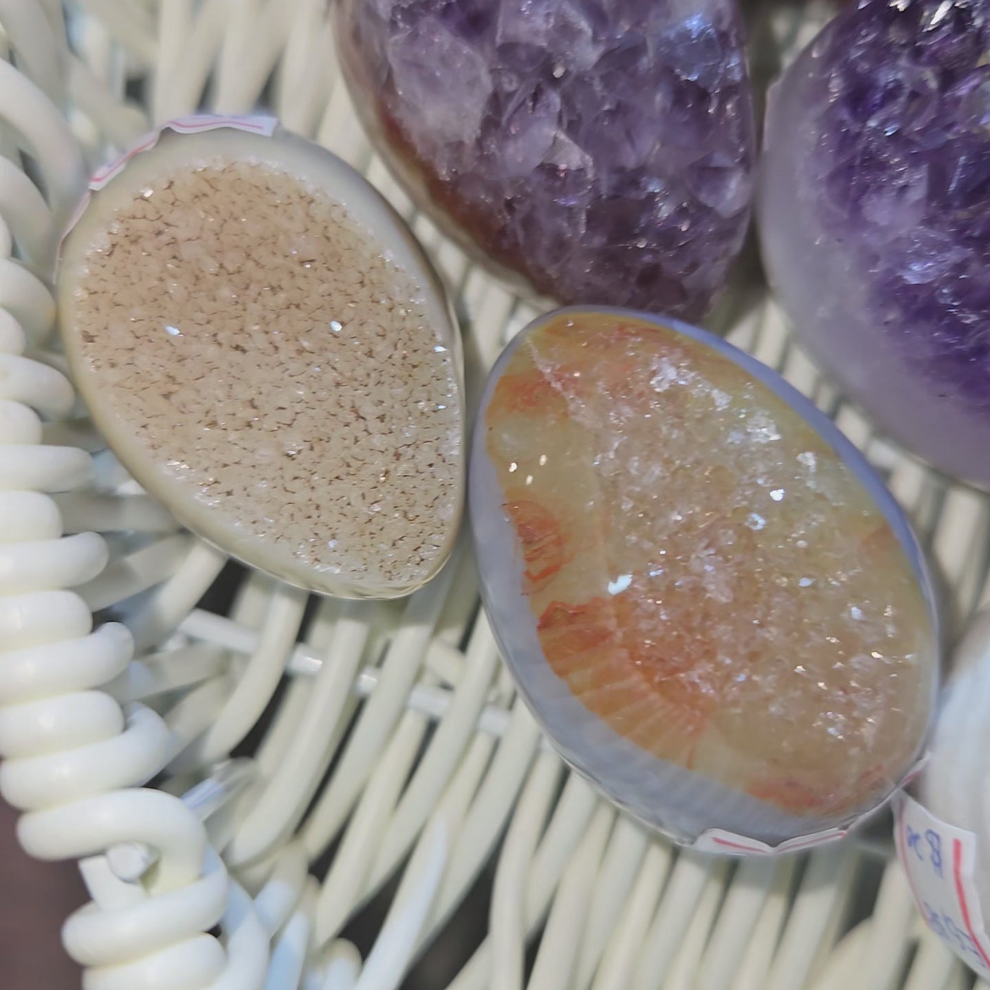 Uruguay amethyst eggs are polished, egg-shaped geodges or crystals formations from Uruguay, famous for their deep, rich purple color, oftern with druzy ( sparkling crystal) interiors, used as decorative items and for spiritual healing in Feng Shui and crystal practices to promote energy.